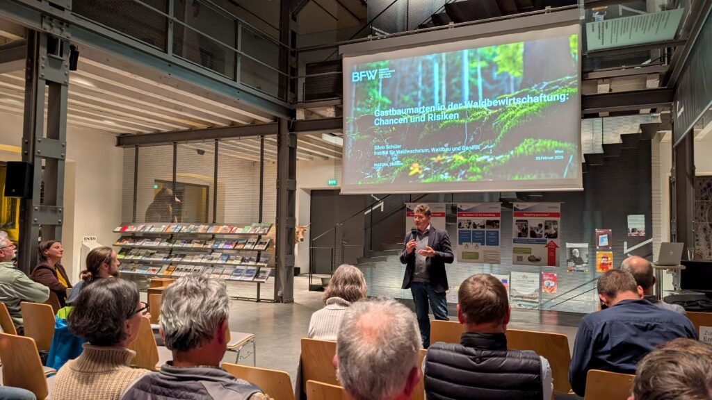 Die Einbringung von Gastbaumarten können eine wichtige Rolle bei der Anpassung an den Klimawandel spielen. Gastbaumarten werden als Chance gesehen, die Stabilität und Resilienz der Wälder gegen Trockenheit und Schädlingsbefall zu erhöhen. Die Holzproduktion kann gesichert werden und neue ökologische Nischen können entstehen. Dr. Schüler betont aber auch die Notwendigkeit der Überprüfung des invasiven Potentials, um die heimische Biodiversität nicht zu gefährden. Im Rahmen der „Waldwandelstudie“ wurden Baumarten in dieser Hinsicht geprüft. Von den in Frage kommenden Baumarten werden den Nadelarten Douglasie, Küstentanne, Riesenlebensbaum (Thuja) und den Laubarten Schwarznuss und Roteiche gute Chancen auf Standorten in Vorarlberg mit keinem oder einem vernachlässigbarem invasivem Verhalten zugesprochen. Je nach Klimamodell ergeben sich etwas unterschiedliche Empfehlungen je nach Höhenlage. Grundsätzlich ist sehr wichtig, dass nicht allein auf Gastbaumarten, sondern auf eine Mischung aus klimafitten heimischen Arten (z. B. Traubeneiche, Weißtanne) und geeigneten Gastbaumarten gesetzt wird.
